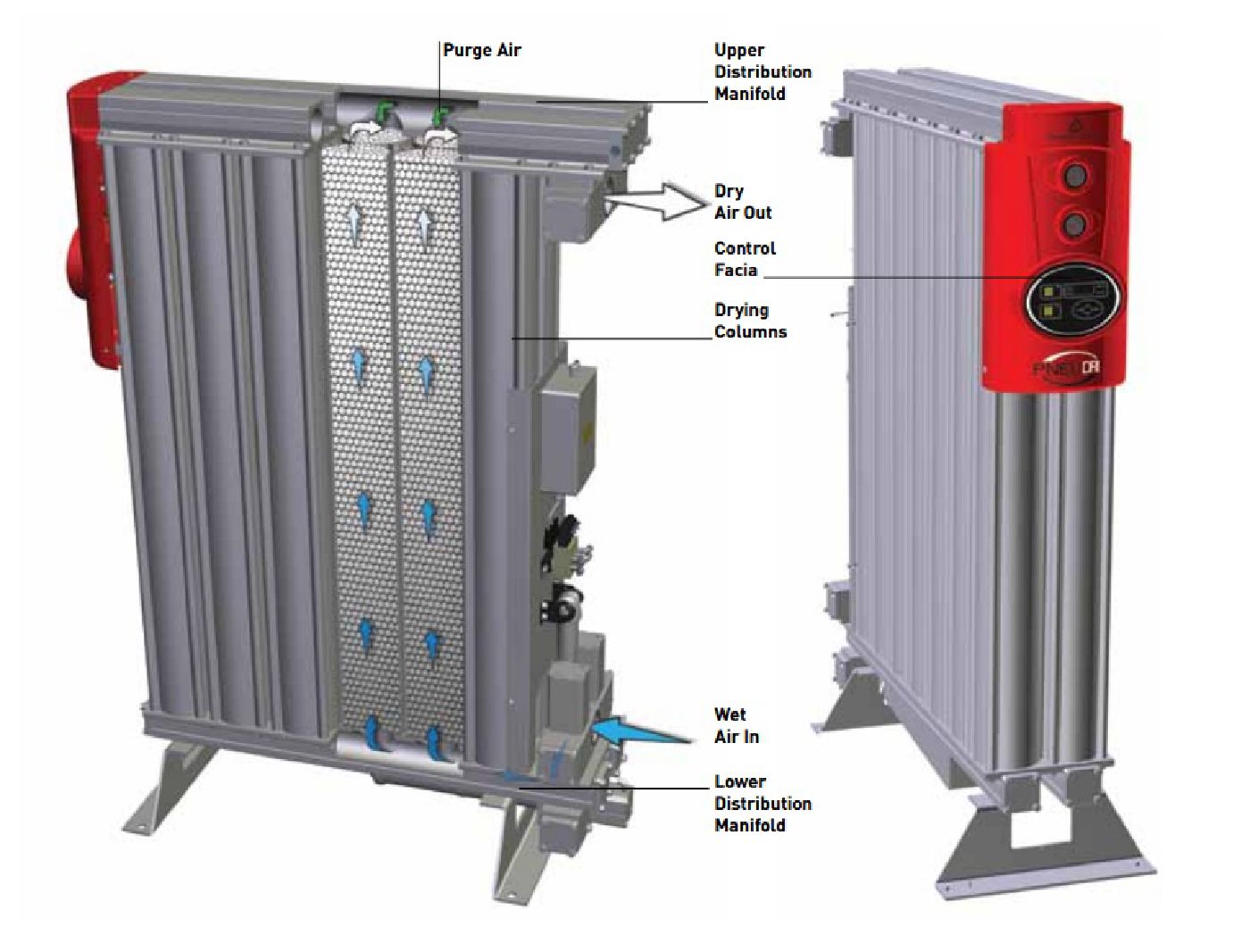 With the proven benefit of advanced aluminum forming technology, Pneudri comprises of high tensile extruded aluminum columns containing twin chambers each filled with desiccant material which dries the compressed air as it passes through. One chamber is operational (drying), while the opposite chamber is regenerating using either the Pressure Swing Adsorption (PSA) [Heatless] or Thermal Swing Adsorption (TSA) [Heat Regenerative] method of drying.
