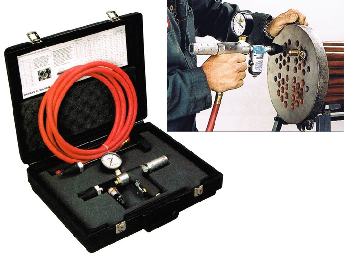 Sealing the far end of each tube with a snap type tube plug then presses the rubber coated nozzle into the near end of the tube and depresses the trigger. Compressed air flows through a venturi chamber to produce a vacuum in the tested tube. When this vacuum reaches a satisfactory level, he releases the trigger. A steady Gauge reading indicates a good tube. A falling vacuum indicates tube leakage.